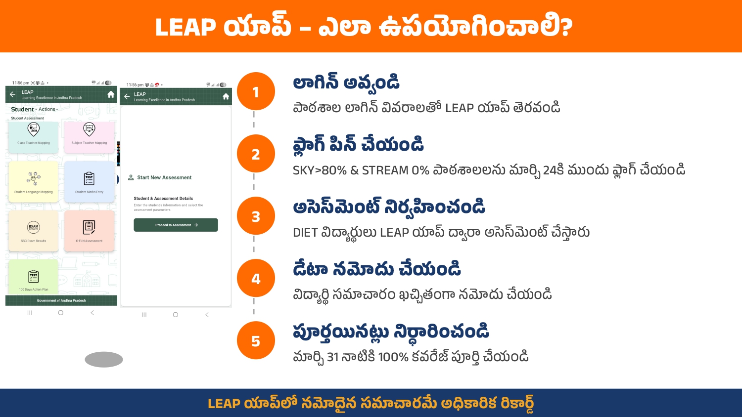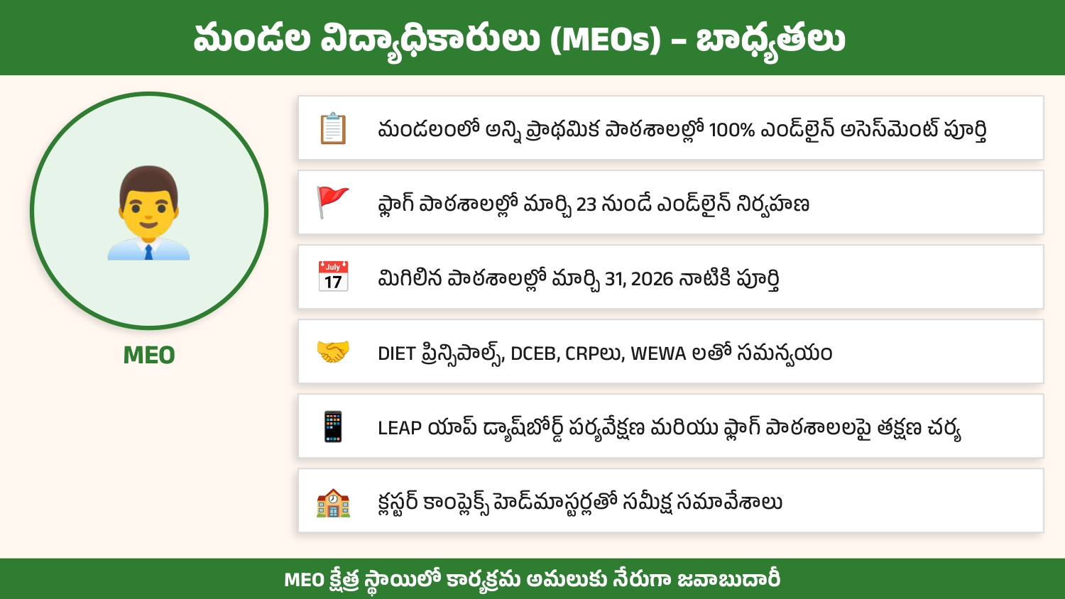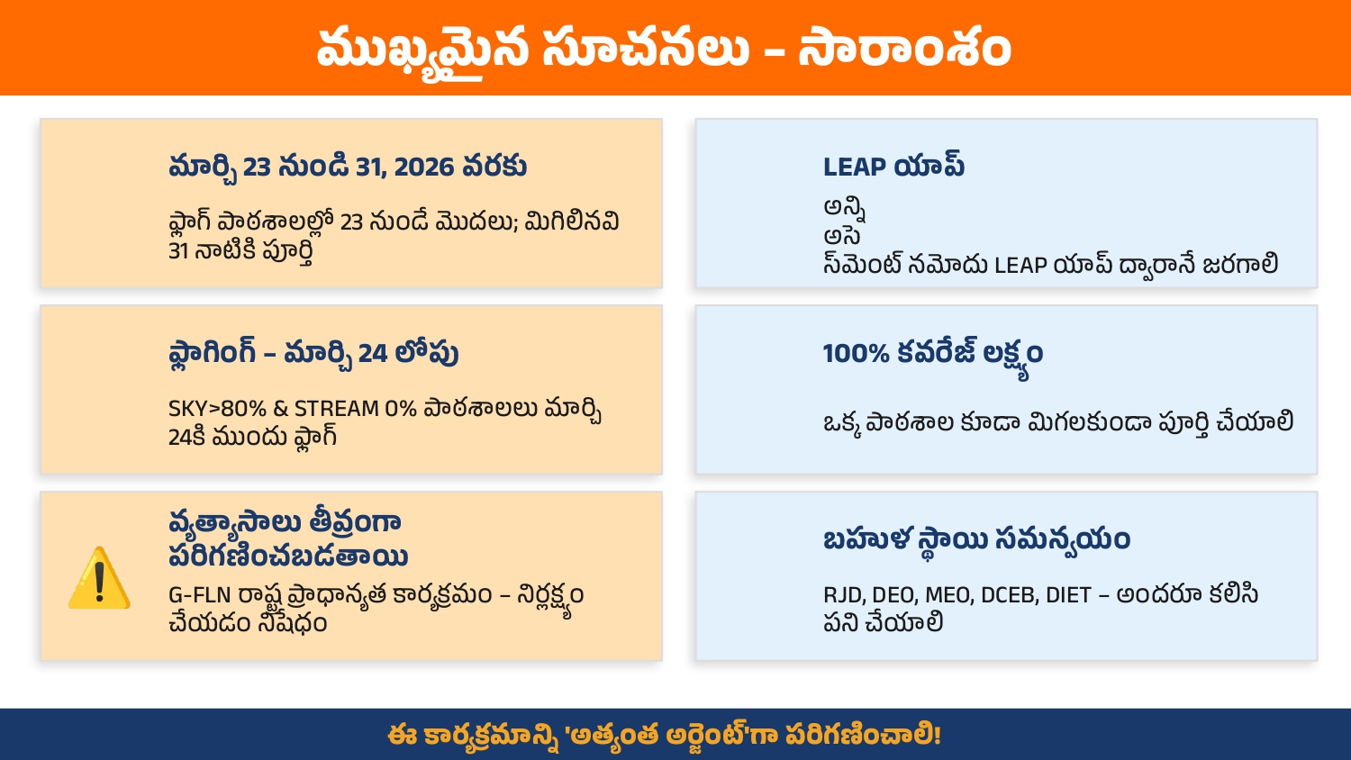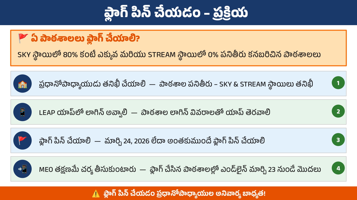 • ప్రధానోపాధ్యాయుల (Headmasters) బాధ్యత: 'స్కై' (SKY) స్థాయిలో 80% కంటే ఎక్కువ మరియు 'స్ట్రీమ్' (STREAM) స్థాయిలో 0% పనితీరు కనబరిచిన పాఠశాలల ప్రధానోపాధ్యాయులు 2026 మార్చి 24 లేదా అంతకంటే ముందు LEAP యాప్‌లో ఫ్లాగ్ (పిన్) చేయాలి.