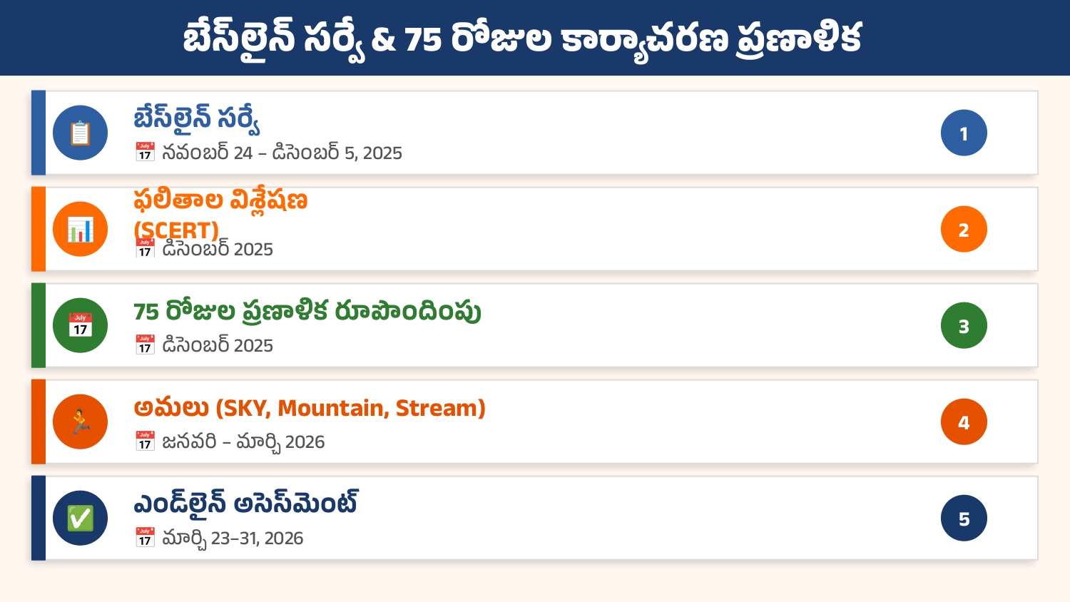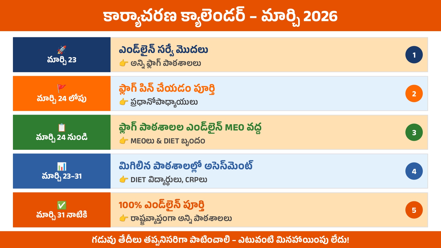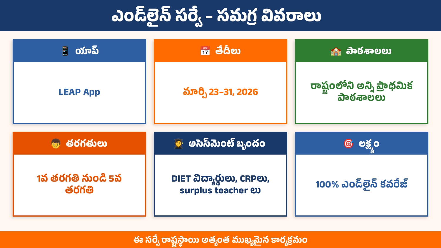 • ఎండ్‌లైన్ సర్వే (Endline Assessment): ఈ ఫైనల్ (ఎండ్‌లైన్) సర్వేను 'LEAP' యాప్ ద్వారా 2026 మార్చి 23 నుండి మార్చి 31 వరకు రాష్ట్రవ్యాప్తంగా ఉన్న అన్ని ప్రాథమిక పాఠశాలల్లో తప్పనిసరిగా నిర్వహించాలి.