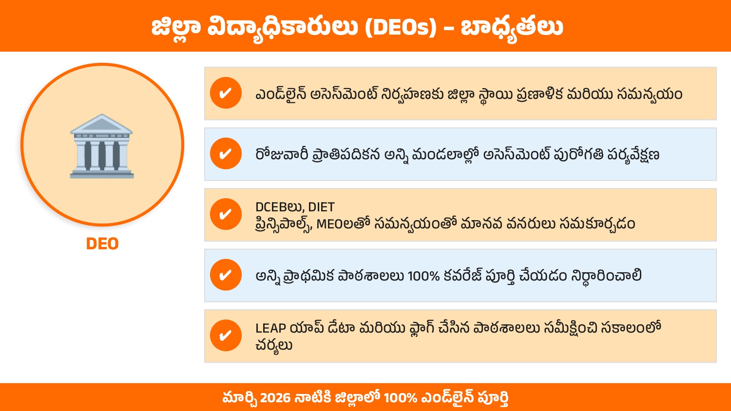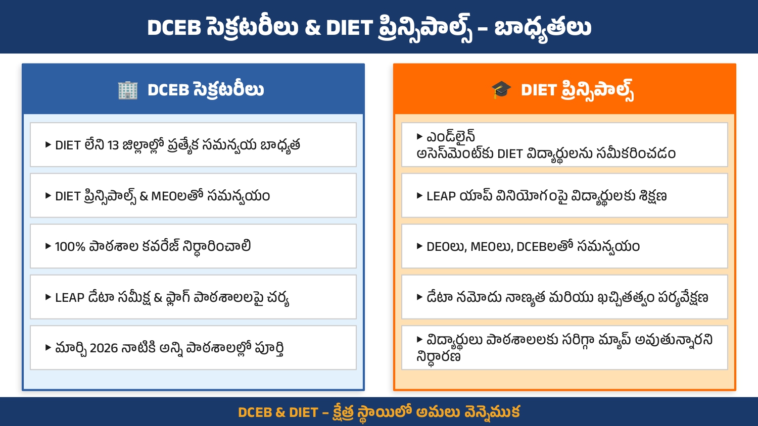 • అధికారుల సమన్వయం: RJDలు, DEOలు, MEOలు, DCEB సెక్రటరీలు మరియు DIET ప్రిన్సిపాల్స్ క్షేత్ర స్థాయిలో సమన్వయంతో పనిచేసి మార్చి 2026 నెలాఖరు నాటికి నూరు శాతం (100%) ఎండ్‌లైన్ అసెస్‌మెంట్ పూర్తయ్యేలా చూడాలి. ఒకవేళ డైట్ (DIET) విద్యార్థులు తగినంత మంది లేకపోతే, పక్క క్లస్టర్ల నుండి CRP లను మరియు సర్ప్లస్ ఉపాధ్యాయులను ఉపయోగించుకోవచ్చు.