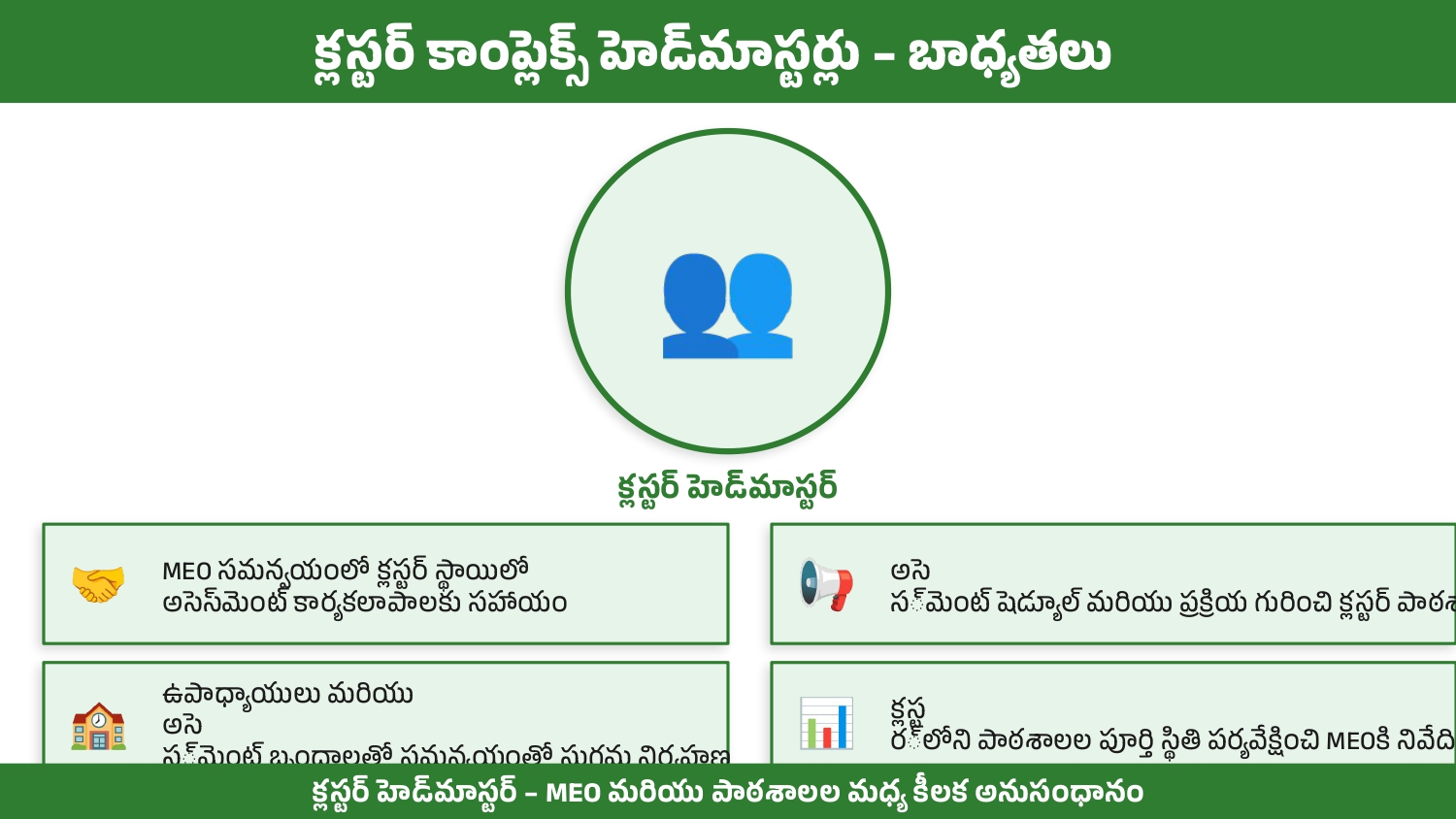 • సర్వే ఎవరు నిర్వహిస్తారు?: ఈ అసెస్‌మెంట్‌ను డైట్ (DIET) విద్యార్థులు, క్లస్టర్ రిసోర్స్ పర్సన్స్ (CRPs), సర్ప్లస్ క్లస్టర్ టీచర్లు మరియు ఇతర నియమిత సిబ్బంది ద్వారా నిర్వహించాలి.