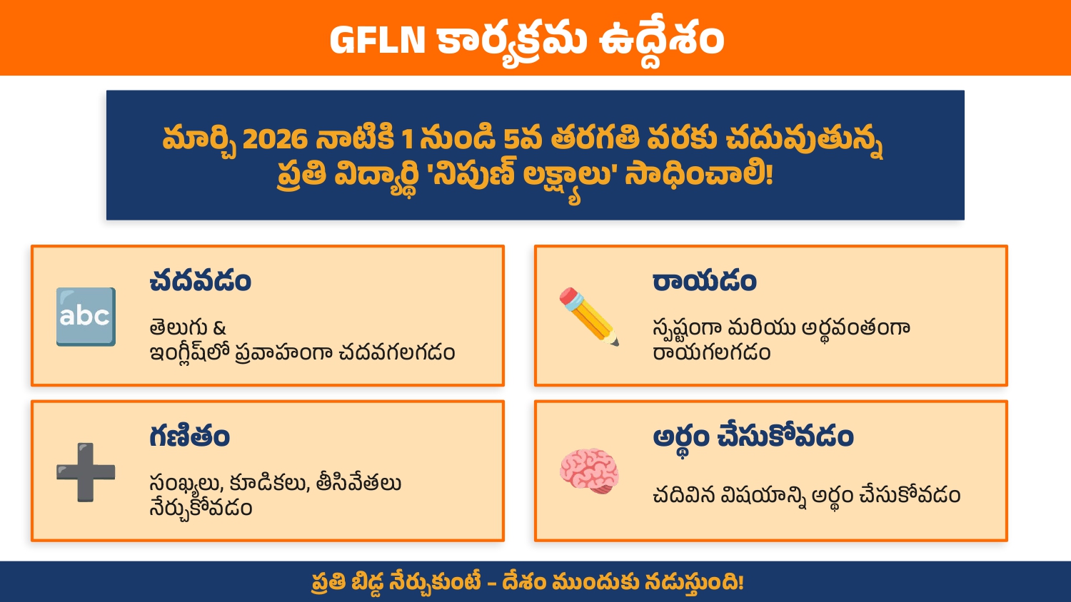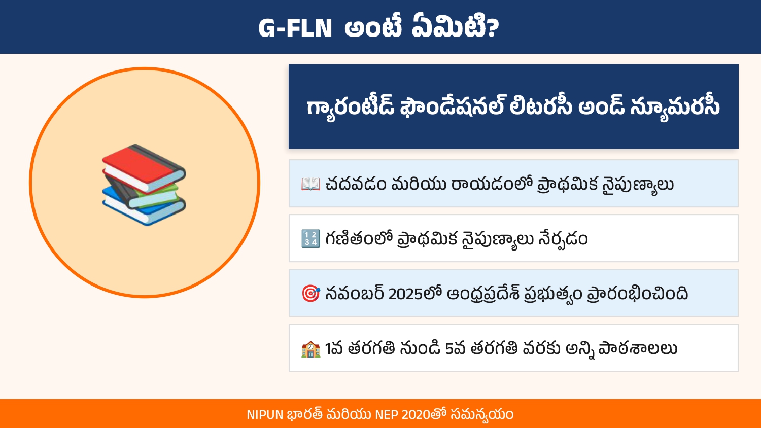 • కార్యక్రమ ఉద్దేశం: 1 నుండి 5వ తరగతి చదువుతున్న విద్యార్థులందరూ 2026 మార్చి నాటికి చదవడం మరియు గణితంలో 'నిపుణ్ లక్ష్యాలను' (NIPUN Lakshyas) సాధించాలనే ఉద్దేశ్యంతో ప్రభుత్వం గ్యారెంటీడ్ ఫౌండేషనల్ లిటరసీ అండ్ న్యూమరసీ (G-FLN) కార్యక్రమాన్ని ప్రారంభించింది.