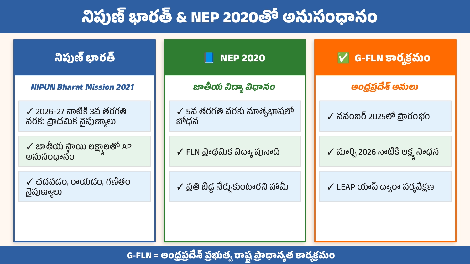 • కార్యక్రమ ప్రాముఖ్యత: ఈ G-FLN కార్యక్రమం జాతీయ విద్యా విధానం (NEP 2020) మరియు నిపుణ్ భారత్‌లకు అనుగుణంగా ప్రభుత్వం చేపట్టిన ప్రాధాన్యతా అంశం. కాబట్టి దీని అమలులో ఎటువంటి ఉల్లంఘనలు లేదా నిర్లక్ష్యం వహించినా తీవ్రంగా పరిగణించబడుతుంది.