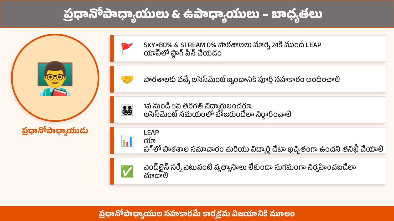 • ప్రధానోపాధ్యాయుల (Headmasters) బాధ్యత: 'స్కై' (SKY) స్థాయిలో 80% కంటే ఎక్కువ మరియు 'స్ట్రీమ్' (STREAM) స్థాయిలో 0% పనితీరు కనబరిచిన పాఠశాలల ప్రధానోపాధ్యాయులు 2026 మార్చి 24 లేదా అంతకంటే ముందు LEAP యాప్‌లో ఫ్లాగ్ (పిన్) చేయాలి.