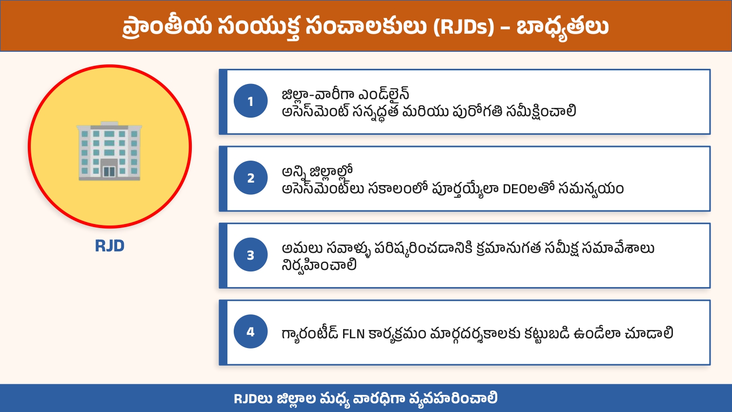 • అధికారుల సమన్వయం: RJDలు, DEOలు, MEOలు, DCEB సెక్రటరీలు మరియు DIET ప్రిన్సిపాల్స్ క్షేత్ర స్థాయిలో సమన్వయంతో పనిచేసి మార్చి 2026 నెలాఖరు నాటికి నూరు శాతం (100%) ఎండ్‌లైన్ అసెస్‌మెంట్ పూర్తయ్యేలా చూడాలి. ఒకవేళ డైట్ (DIET) విద్యార్థులు తగినంత మంది లేకపోతే, పక్క క్లస్టర్ల నుండి CRP లను మరియు సర్ప్లస్ ఉపాధ్యాయులను ఉపయోగించుకోవచ్చు.