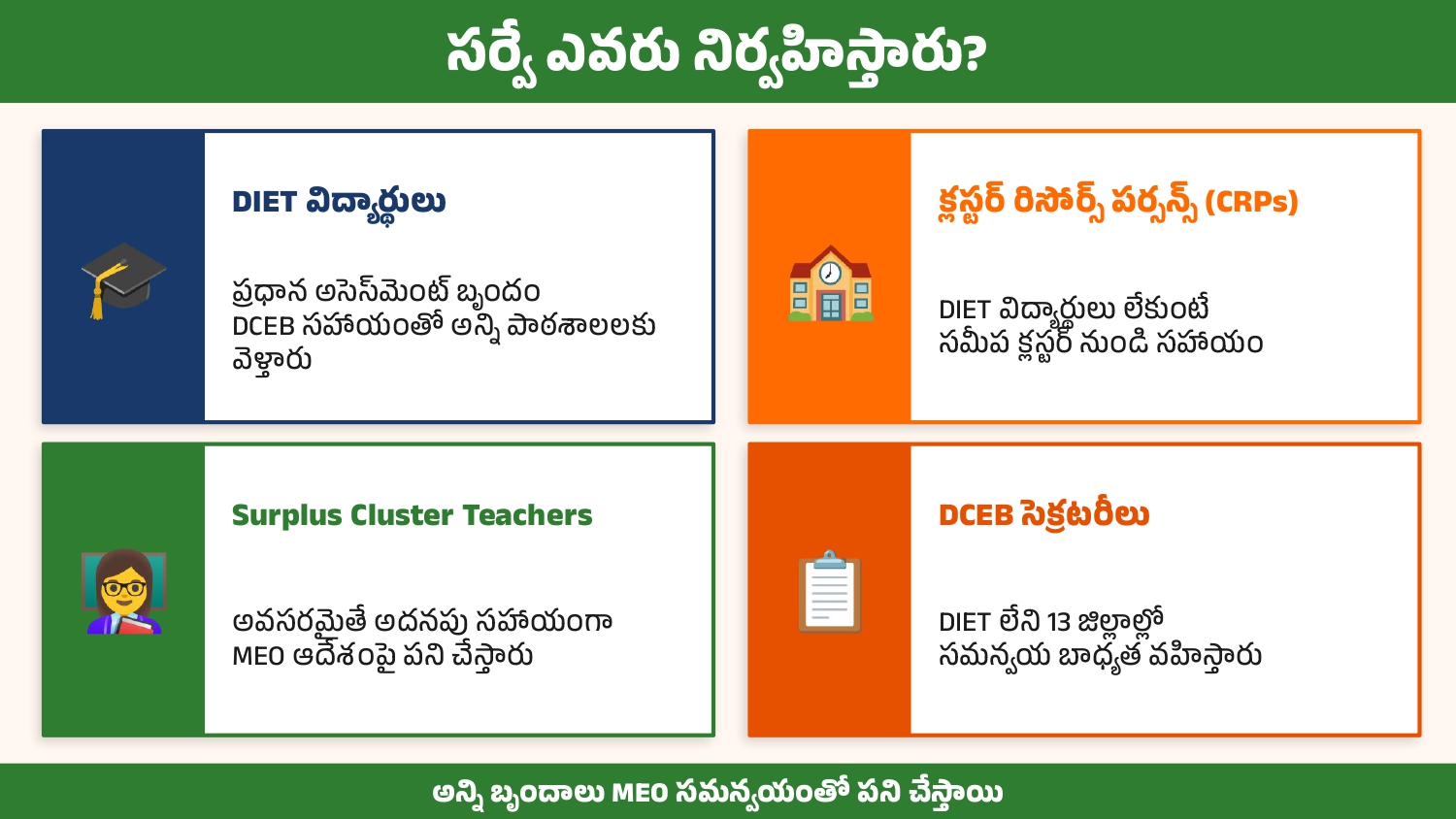 • సర్వే ఎవరు నిర్వహిస్తారు?: ఈ అసెస్‌మెంట్‌ను డైట్ (DIET) విద్యార్థులు, క్లస్టర్ రిసోర్స్ పర్సన్స్ (CRPs), సర్ప్లస్ క్లస్టర్ టీచర్లు మరియు ఇతర నియమిత సిబ్బంది ద్వారా నిర్వహించాలి.